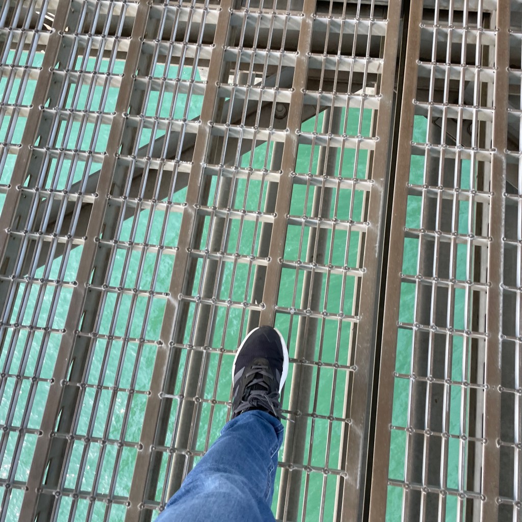 這工程用通道一般遊客是不能走進來的,我們得沿著通道走到橋中央的主塔處,再搭乘電梯到達頂端。工程用通道走了許久,腳下是金屬鐵柵欄的路,透過空隙可以看得見40公尺下的海平面上的波浪;怕高的人還是會有點緊張。偶而也可以聽到頭頂橋面上車子來往的聲音。